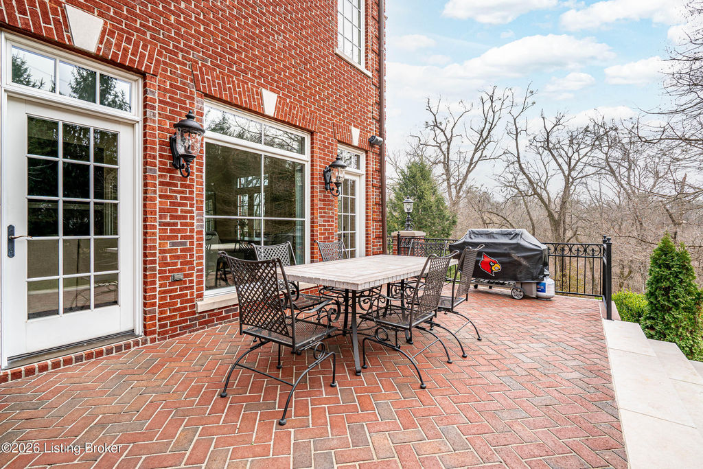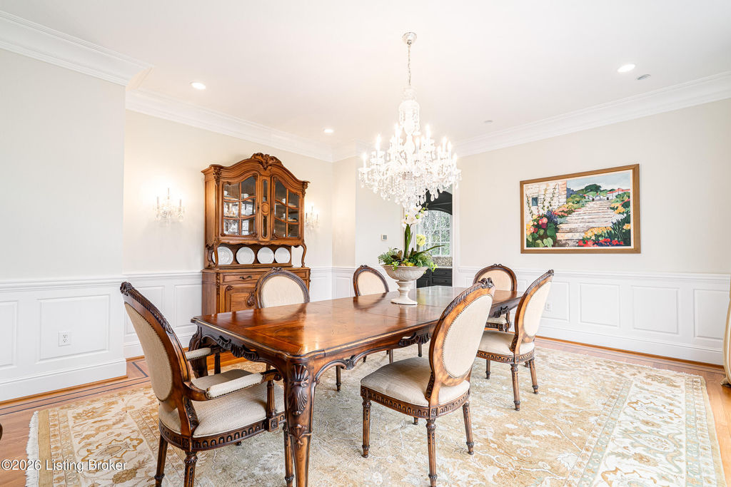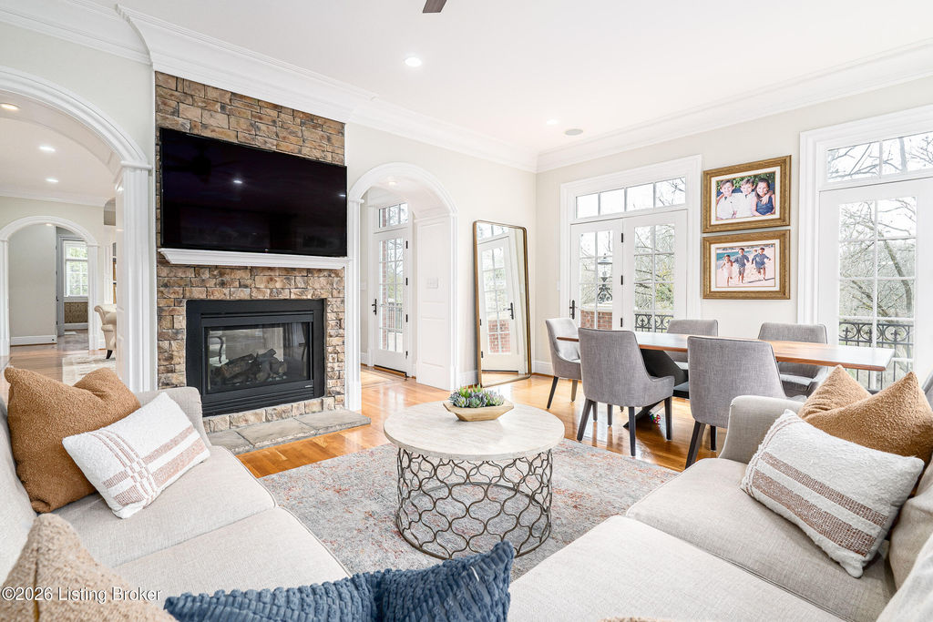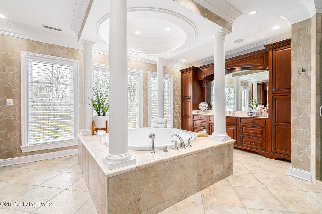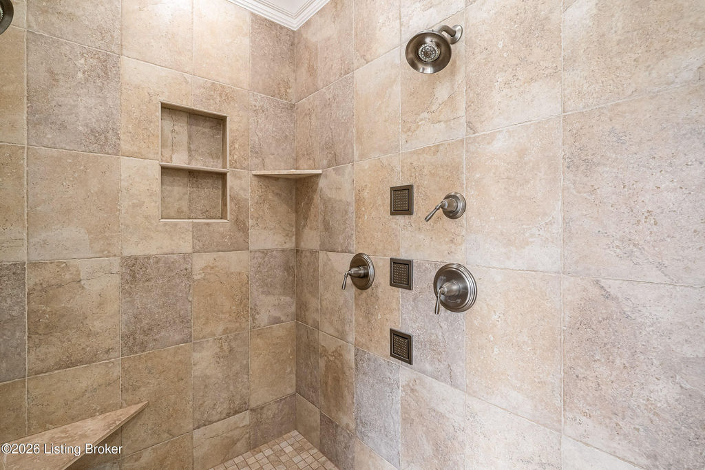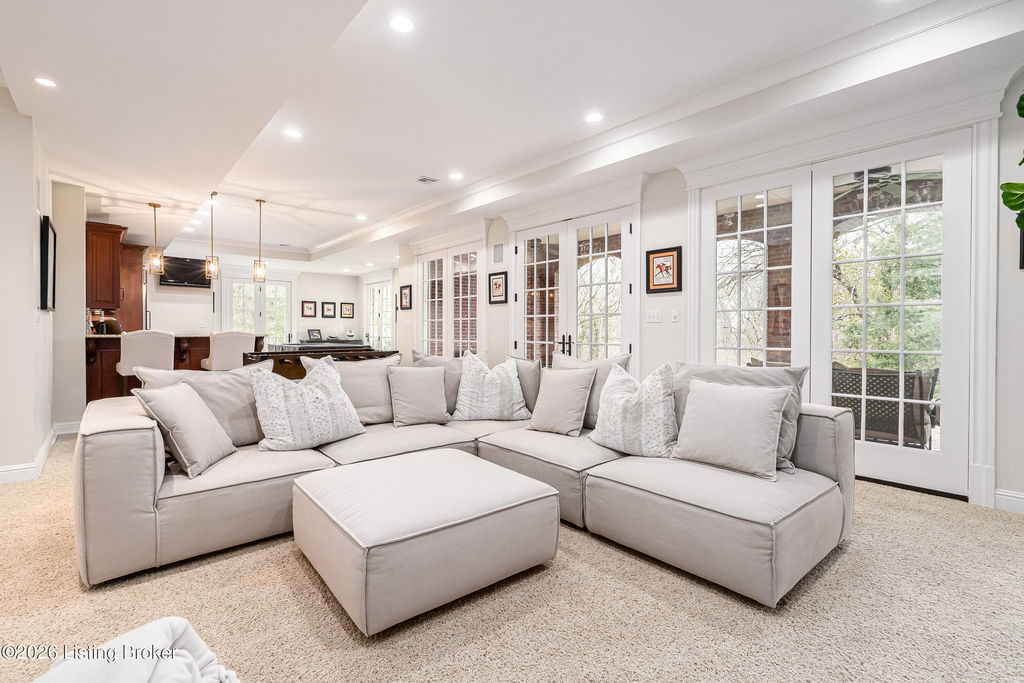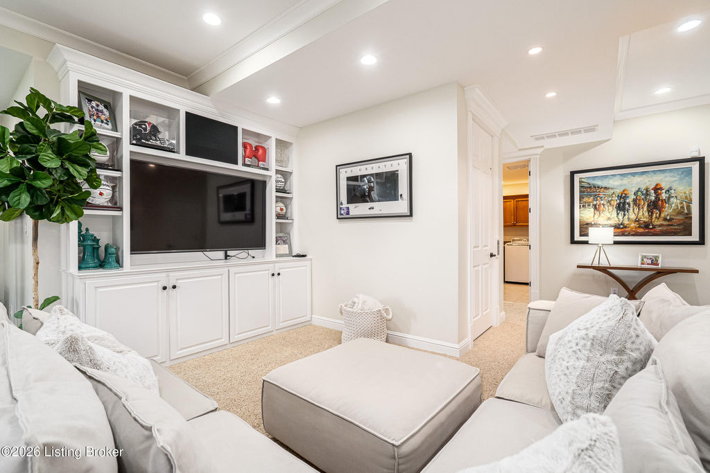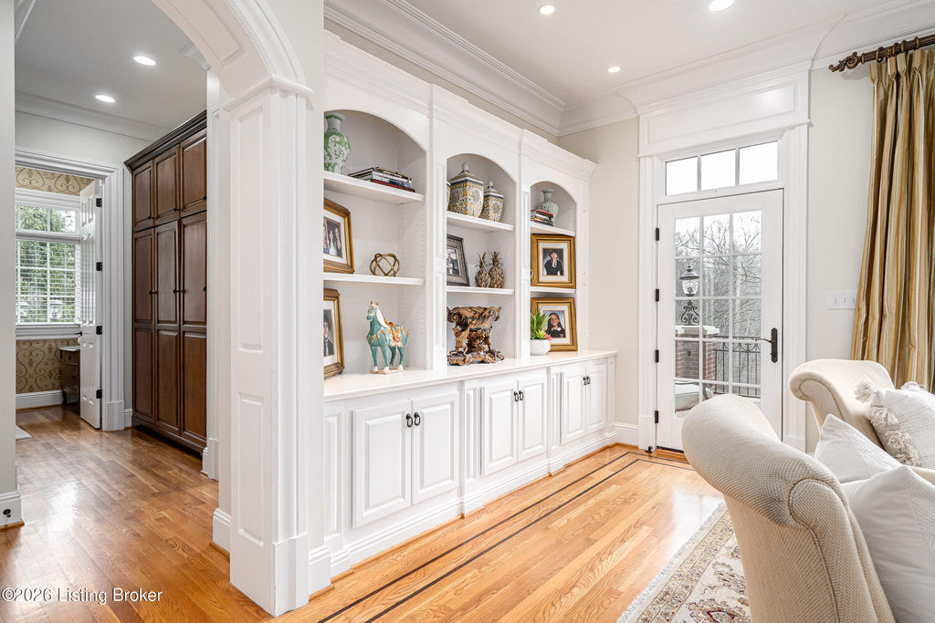 Custom-built in 2006 and ideally situated on over 1.7 acres in prestigious Indian Hills, this five-bedroom home offers quality construction, thoughtful design, and modern efficiency. Each bedroom features its own en-suite bathroom, along with multiple living spaces designed for comfort and entertaining. The home includes geothermal heating and cooling, a new roof 2026, and an elevator servicing all three floors. The welcoming foyer introduces arched entryways, detailed millwork, hardwood flooring, and vaulted ceilings that continue across the main level. The great room features built-in bookcases, a gas fireplace, and expansive rear views from the balcony that spans the back of the residence. The gourmet kitchen offers an oversized island, custom cabinetry, high-end appliances, and a butler's pantry, with an adjacent formal dining room. A tucked-away office space with access to the rear patio has potential for a first-floor bedroom. Upstairs, three generous en-suites include a well-appointed primary bedroom with a sitting area, private balcony access, dual oversized closets, and a spacious bath with soaking tub and separate shower. The lower level expands the home's versatility with a large living area, full kitchen, theater room, hidden wine cellar, and additional bedroom suite. A three-car garage completes this exceptional Indian Hills property. Featured in a Courier Journal article dated April 23, 2023.