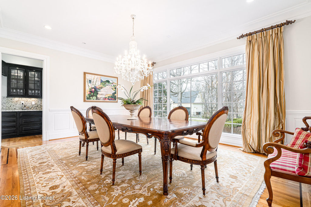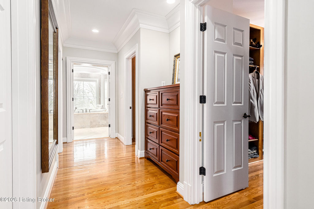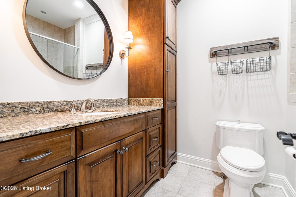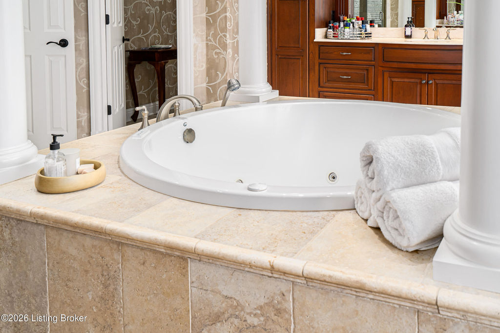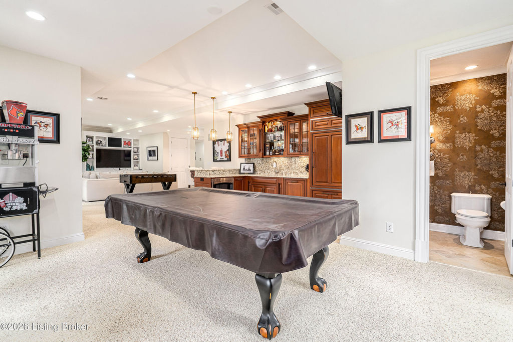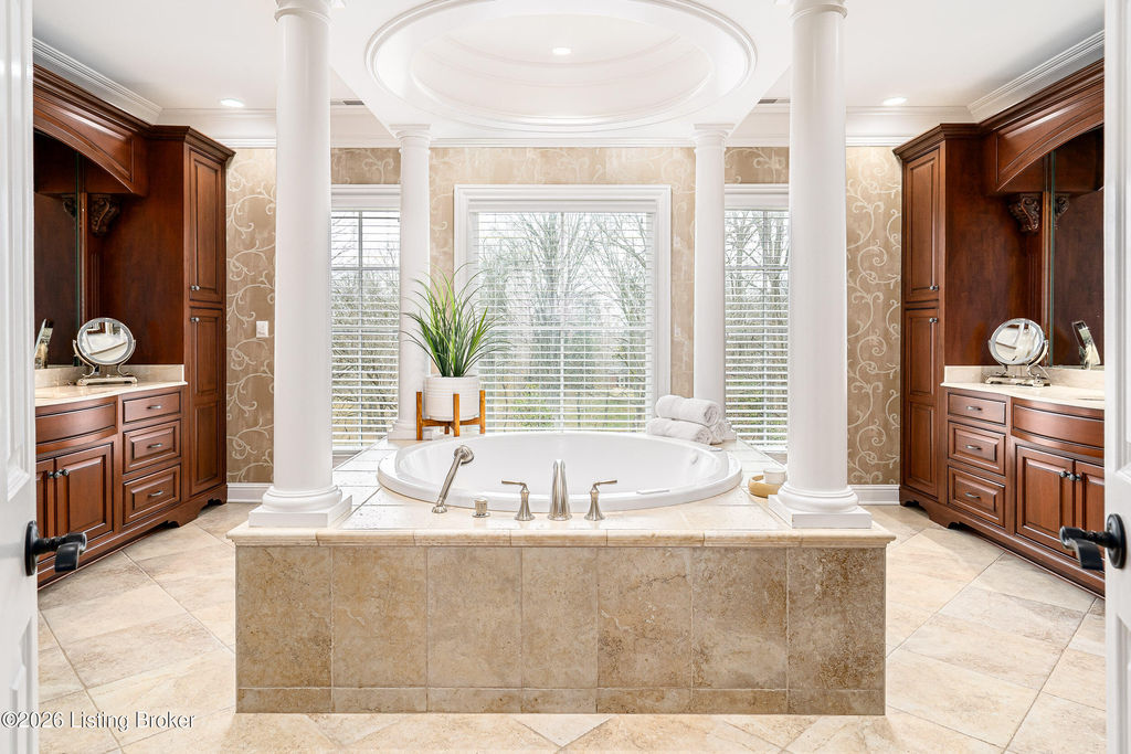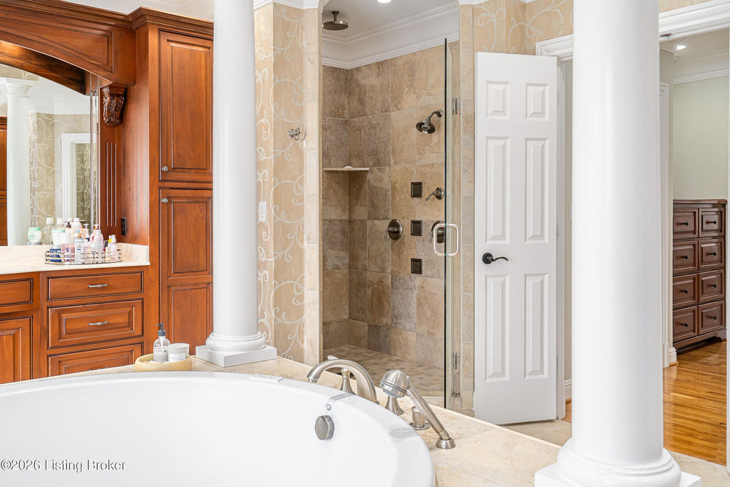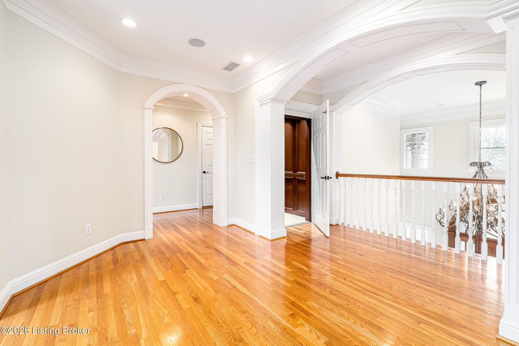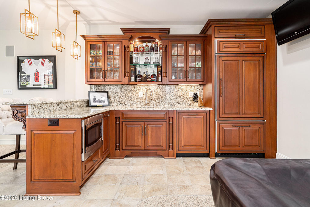 Custom-built in 2006 and ideally situated on over 1.7 acres in prestigious Indian Hills, this five-bedroom home offers quality construction, thoughtful design, and modern efficiency. Each bedroom features its own en-suite bathroom, along with multiple living spaces designed for comfort and entertaining. The home includes geothermal heating and cooling, a new roof 2026, and an elevator servicing all three floors. The welcoming foyer introduces arched entryways, detailed millwork, hardwood flooring, and vaulted ceilings that continue across the main level. The great room features built-in bookcases, a gas fireplace, and expansive rear views from the balcony that spans the back of the residence. The gourmet kitchen offers an oversized island, custom cabinetry, high-end appliances, and a butler's pantry, with an adjacent formal dining room. A tucked-away office space with access to the rear patio has potential for a first-floor bedroom. Upstairs, three generous en-suites include a well-appointed primary bedroom with a sitting area, private balcony access, dual oversized closets, and a spacious bath with soaking tub and separate shower. The lower level expands the home's versatility with a large living area, full kitchen, theater room, hidden wine cellar, and additional bedroom suite. A three-car garage completes this exceptional Indian Hills property. Featured in a Courier Journal article dated April 23, 2023.